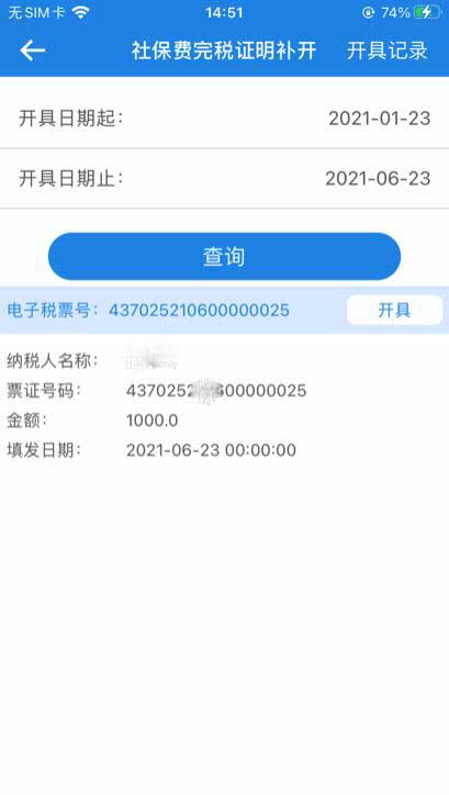 进入查询界面点击企业查询“社保费完税证明”,点击“补开查询”。进入社保费完税证明补开界面,选择开票日期起止时间,点击查询出现列表。点击列表右上角“开具”即可下载并查看该电子税票号具体开具内容。查看开具记录同上。如下图: