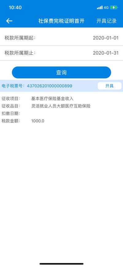 进入查询界面点击公众查询“社保费完税证明”, 点击“首开查询”。进入社保费完税证明首开界面,选择税款所属期起止时间,点击查询出现列表。点击“开具”即可下载并查看该电子税票号具体开具内容。查看开具记录同上。如下图: