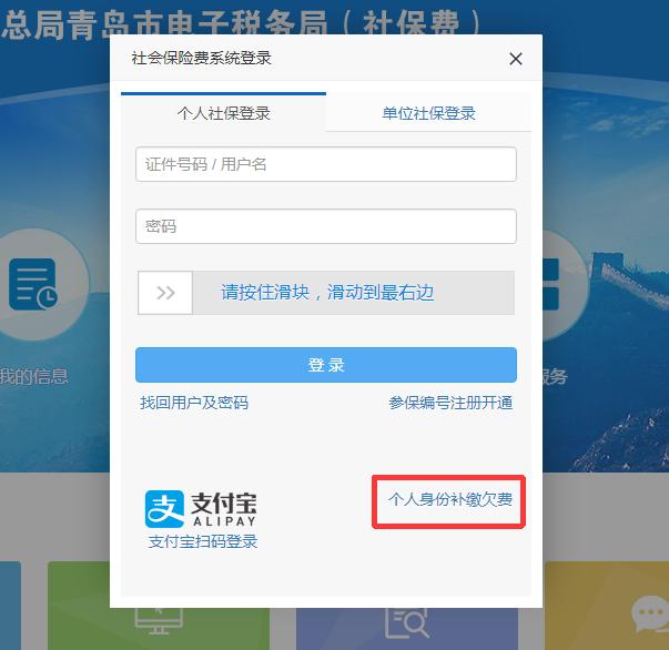 社会保险费系统登录界面,点击“个人身份补缴欠费”,进入功能查询界面;