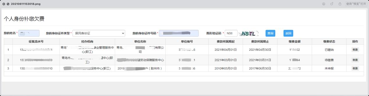 在功能页面输入“姓名”,“证件号码”,选择对应的证件类型,输入验证码后,点击“查询”按钮即可查询个人需要补缴的信息;