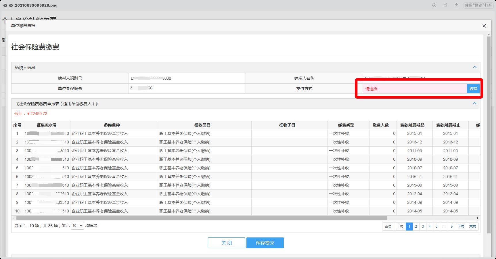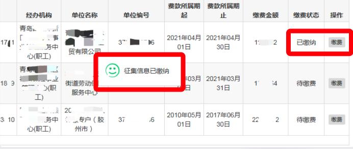 查询信息包含:征集流水号、经办机构、单位名称、单位编号、费款所属日期起止、缴费金额、缴费状态;