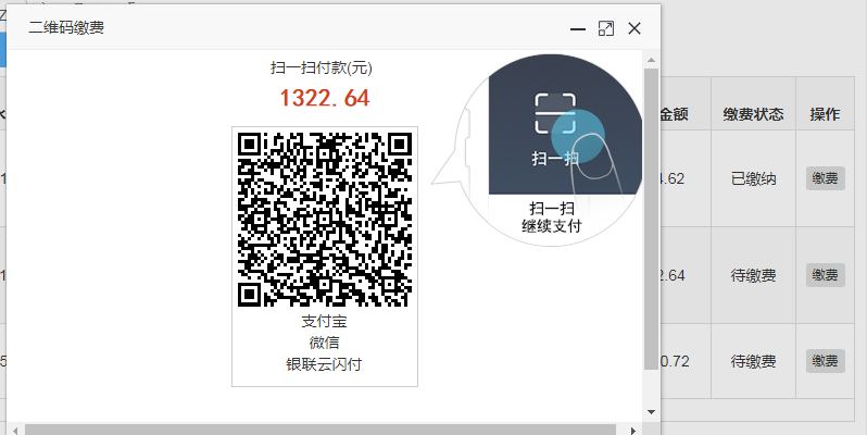 点击“缴费”按钮后,会弹出二维码窗口,使用手机支付,完成缴费操作。