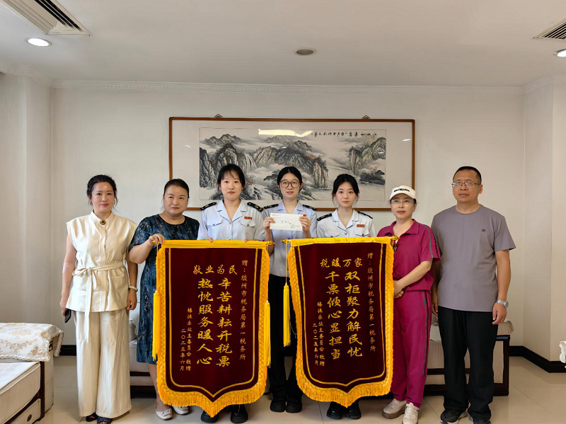 自2025年4月份起,胶州市禧徕乐众多业主需集中开具近1500份房屋租赁发票,其中大部分为中老年人,面对时间紧、任务重的情况,胶州局第一税务所急群众之所急,主动靠前服务,展现出了高度的责任感和专业素养。在长达两个月的开票周期内,工作人员始终秉持“始于纳税人需求,终于纳税人满意”的理念,细致高效办理,热情周到服务,积极为纳税人排忧解难,确保每一份发票都准确无误。为表达谢意,禧徕乐业主委员会来到胶州局送上了饱含赞誉的锦旗和感谢信,并对税务人员在办理该项业务过程中展现出的专业能力、敬业精神和真诚服务深表感动。
