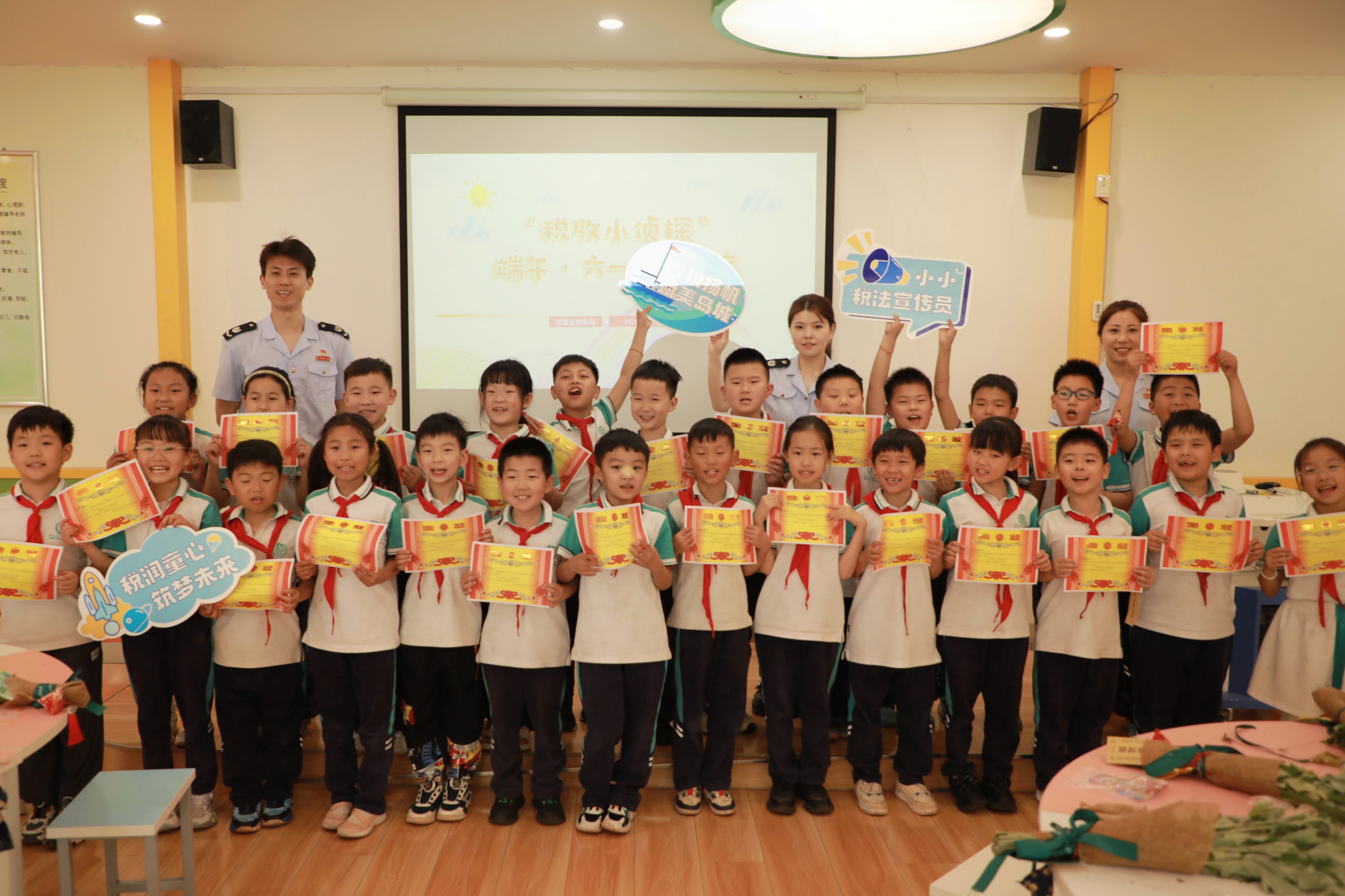 “税法小小宣传员”奖状颁发仪式将活动推向高潮。孩子们郑重接过奖状,稚嫩的脸上写满自豪。手捧奖状的范梦桐同学认真地说:“我要把艾草花束和今天学到的知识都带回家,告诉爸爸妈妈,我们一起守护传统文化和税收的‘魔法力量’,守护我们的家园!”这一刻,孩子们化身守护税法的小小火种,将“诚信纳税”的理念从校园带回家庭、播向社会。
